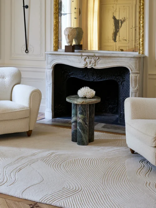 Vaibal on keerukas geomeetriline muster, mis meenutab nõrgalt abstraktset kunsti, mis annab selle pinnale peene visuaalse tekstuuri. Tagasihoidlik värvilahendus, mida rõhutavad pehmed variatsioonid, loob mulje sügavusest ja keerukusest.